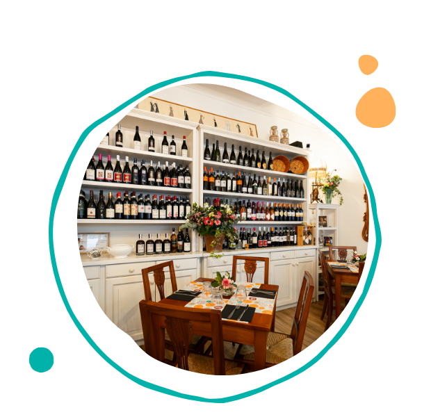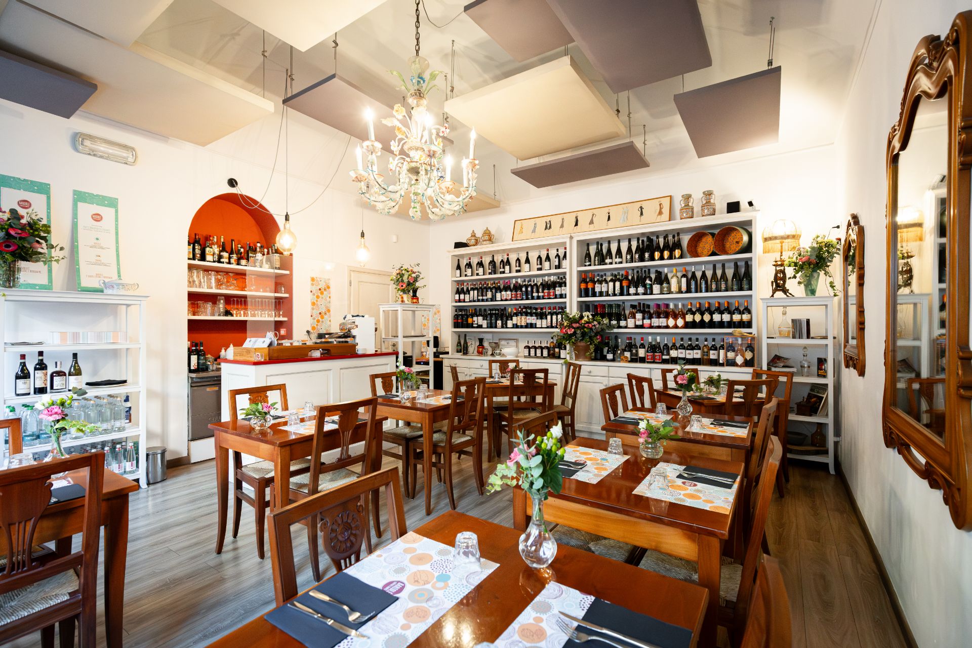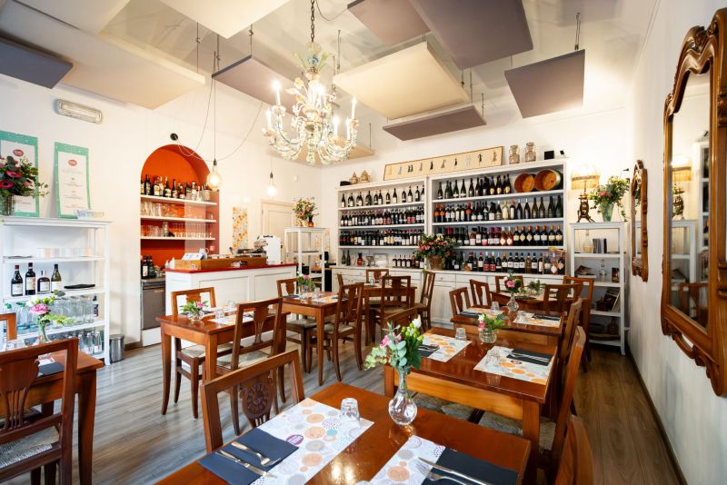 Una sala calda e luminosa, piena di dettagli colorati, e durante la bella stagione ti accogliamo anche nel nostro dehor esterno, curato e fiorito.